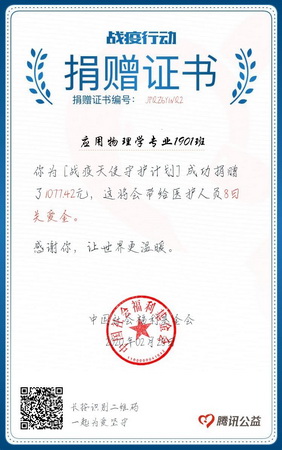 1个小时、37名同学、1077.42元捐款。2月28日,304永利集团应用物理学1901班班长周梦薇将全班同学的捐款通过腾讯公益的“战役天使守护计划”捐给了抗击疫情一线的医护人员。