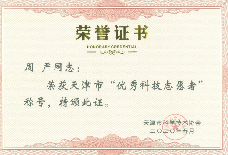 近日,天津市科学技术协会发文公布天津市优秀科技志愿者、优秀科技志愿服务队表彰人员、团队评选结果。公司周严老师荣获天津市“优秀科技志愿者”称号。