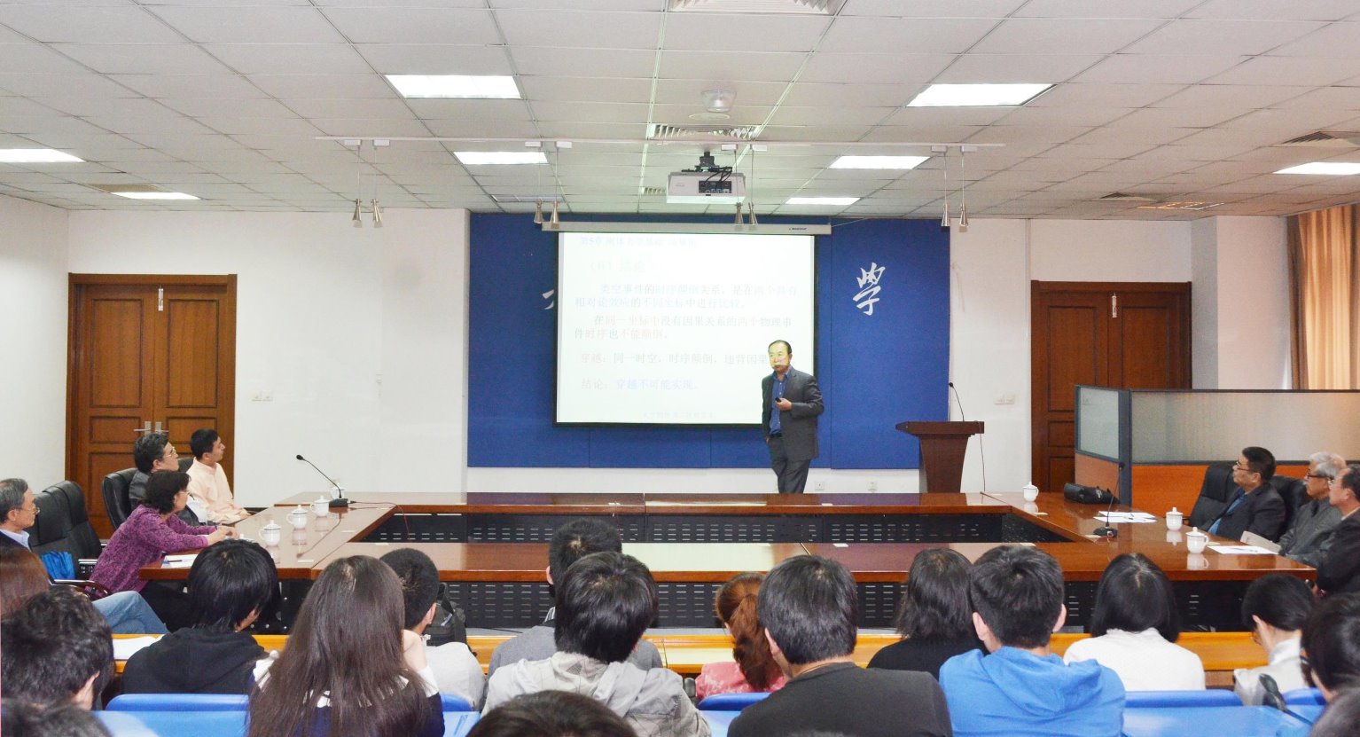 随后,物理系于学刚教授和郝志强博士分别作了题为《物理未解之谜》和《贵金属的小尺寸光学效应》的学术报告。于学刚教授以深厚的物理理论功底为师生解答了三个物理领域有趣的问题:首先,从时间的方向性角度解释了目前广受关注的问题“能穿越吗”;随后,结合于教授本人的理论研究工作分析了杨-米尔斯方程中“me和ε0去哪了”,最后利用薛定谔方程回答了“有反物质吗”。郝志强博士为大家介绍了小尺寸光学效应这样一个特殊的材料物理特性,从材料尺寸对电子输运的影响阐释了物理机理,并展示了此项研究在集成光路、光子器件等方面的应用。两位老师的报告引起了在场师生的极大兴趣,并希望今后能够听到更多教师进行此类学术报告。报告结束后教师之间、师生之间仍就关心的问题进行亲切探讨。