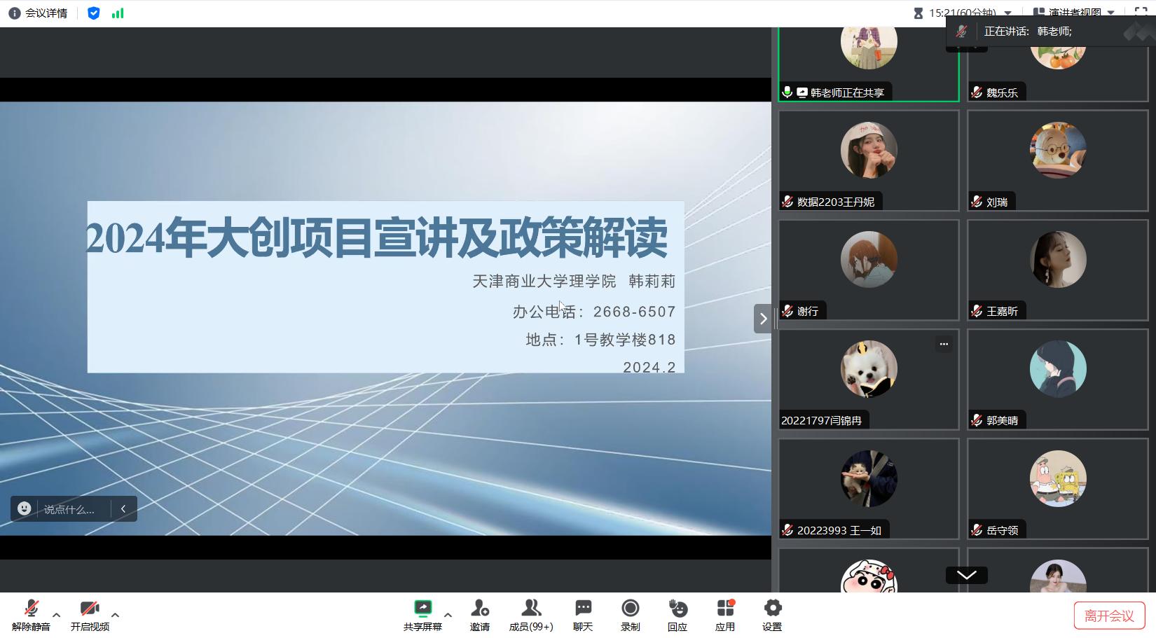 韩莉莉从大创项目发展历程出发,详细介绍了大创申报、中期检查、结项、推优、经费使用、日常管理服务等六个重要阶段的工作流程、各级政策及注意事项。她结合自身管理实践出发,鼓励同学们结合专业知识和个人兴趣积极申报大创,合理规划团队活动,取得更多项目成果。