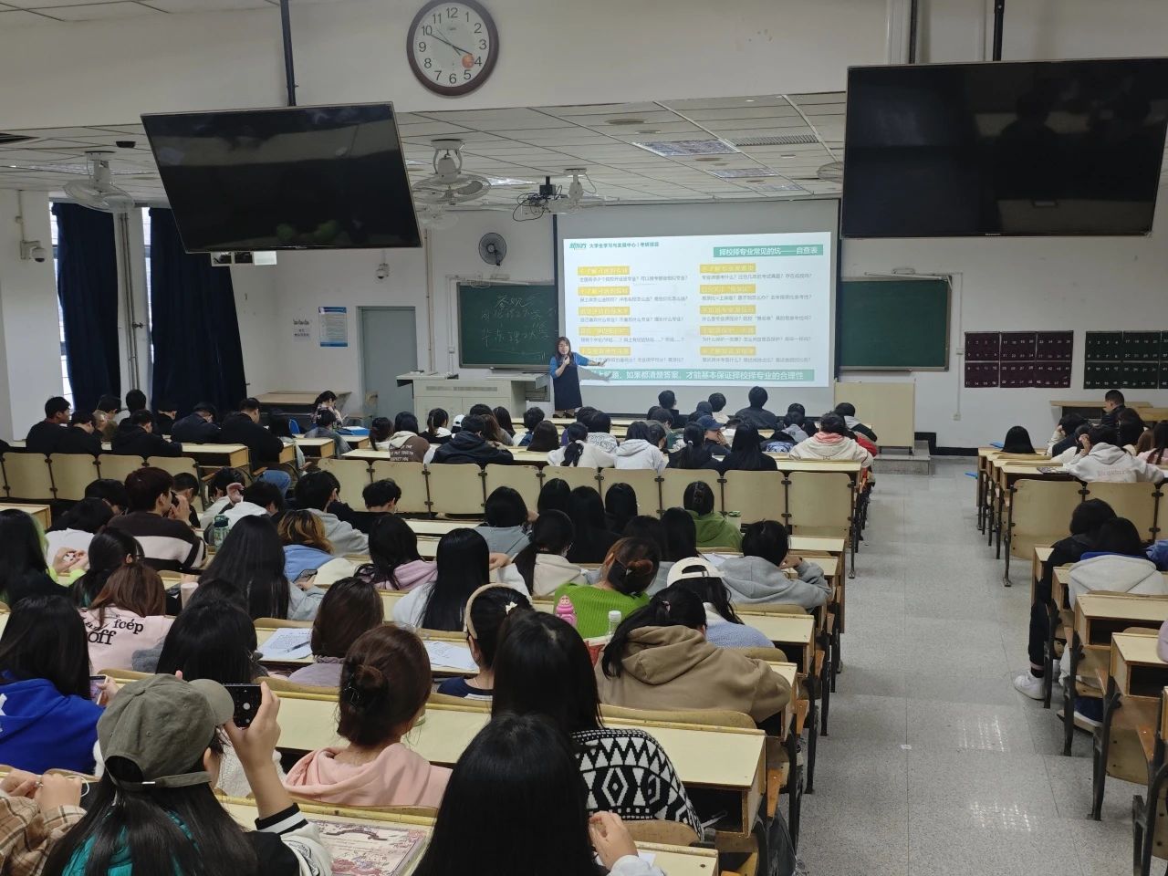 10月26日下午在4教101教室,公司为帮助大三员工充分了解目前的就业形势及公司近三年的就业率;同时让考研员工更好地了解当下研究生考试考情及适合公司各专业报考的院校专业,营造浓厚的考研备考氛围,组织开展了2022级本科生年级大会,会上邀请新东方集团郝瑞雪老师给同学们介绍如何选择考研院校及专业,本次会议共260余人参加。